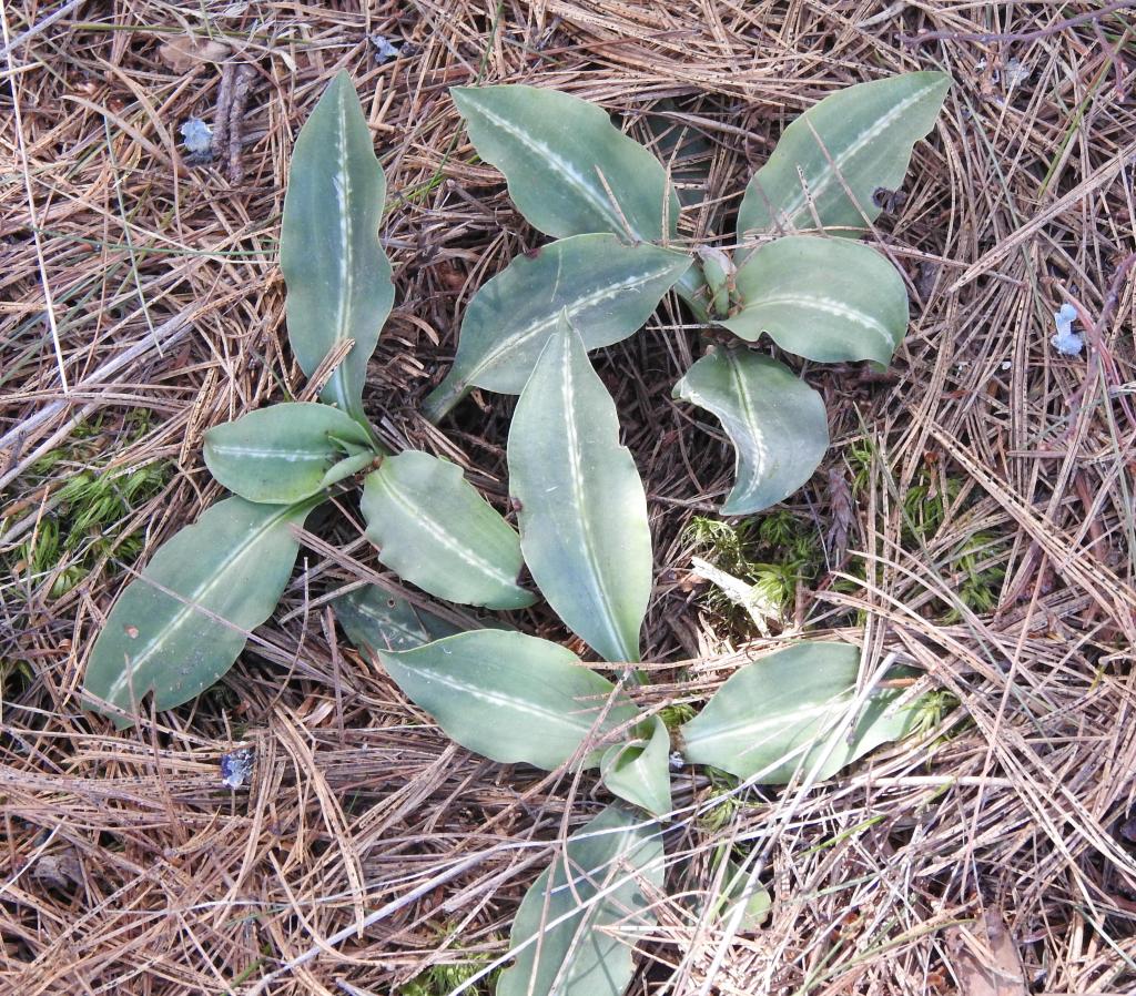 Another new patch of “Menzies rattlesnake plantain,” an orchid that should be blooming in another two months.