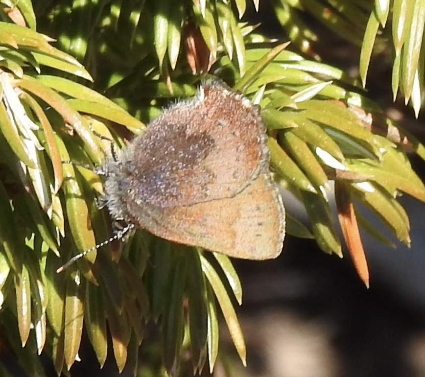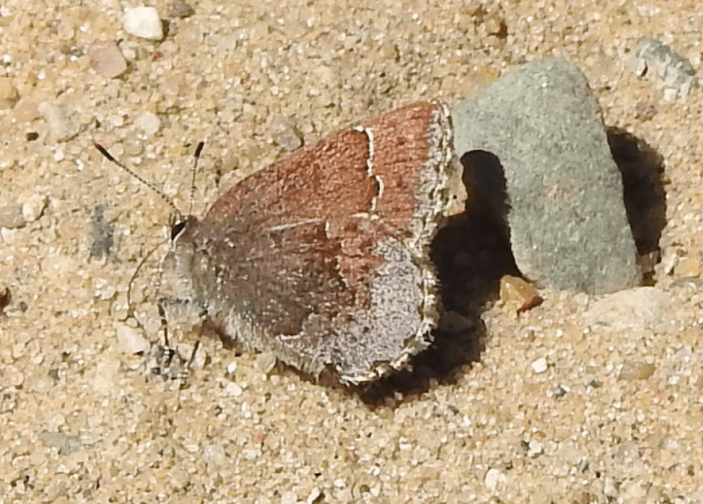The sandy roads near the cabin had lots of butterflies recently. This hoary elfin is quite small (as are all of the elfins) and was the second most numerous elfin on the roads.