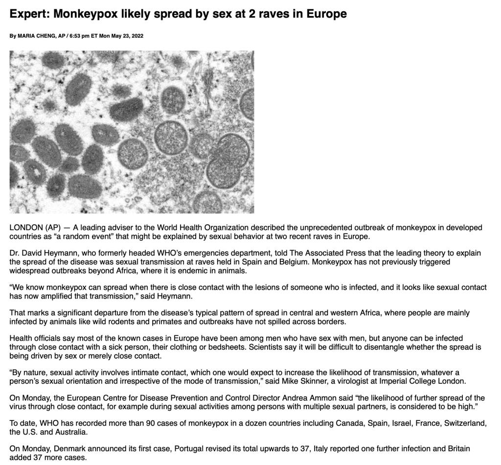 The current status of the Monkeypox epidemic seems to have started at two events in Europe. Basically, unless you have any physical contact with somebody with the disease there is little chance of getting it. Once again, medical staff are most as risk of getting the virus by working with patients who have the disease.
