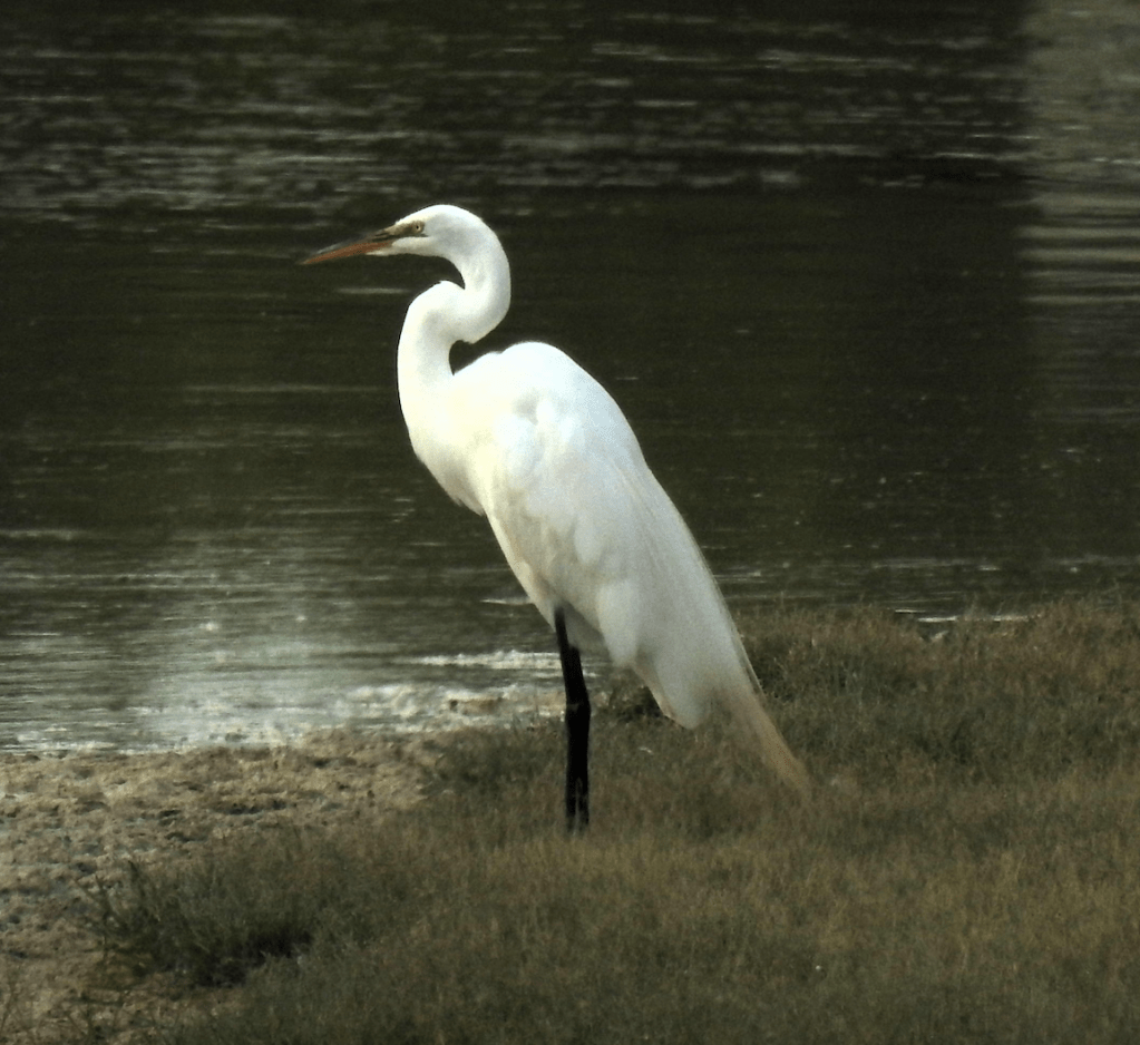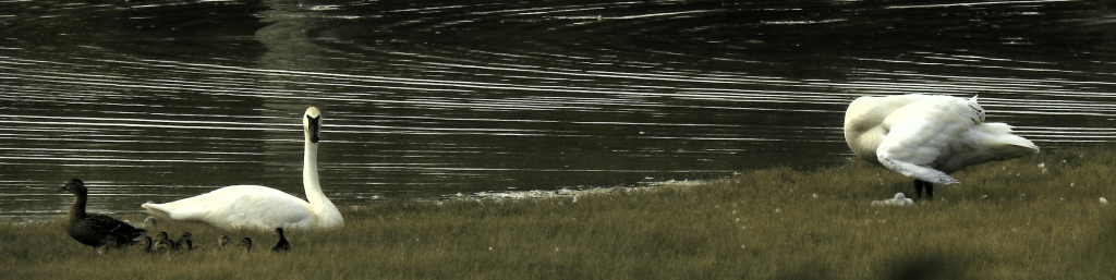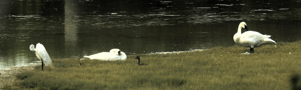 Going left to right was a Great Egret, then one swan and finally the other with a cygnet.