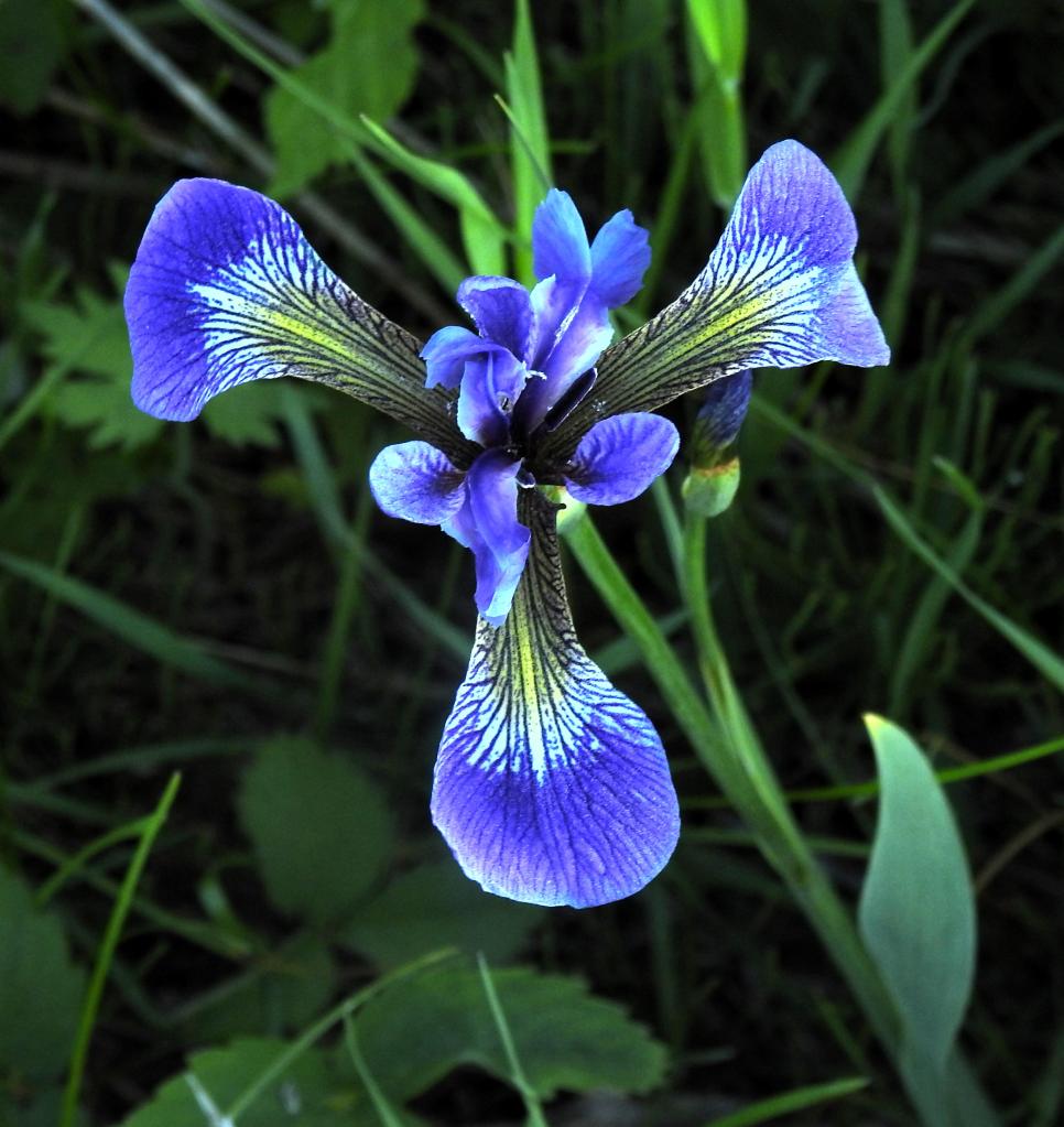 The blue flag are now in bloom between the cabin and the point.