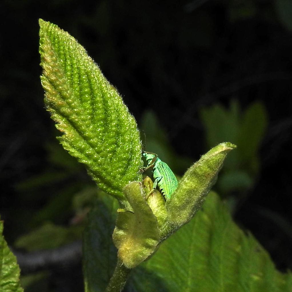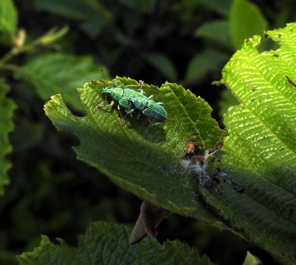 The culprit is a small green weevil, Polydrusus formosus. Not only did we find many individuals, but also numerous mating pairs.