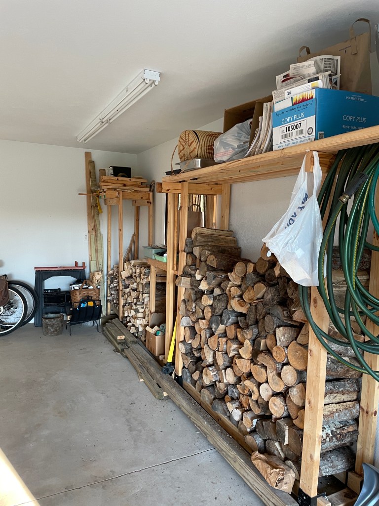 We’ve been slowly working our way through the pile of wood that was delivered before we arrived. Some goes into the wood shed, some get split into smaller pieces or kindling going into the garage.
