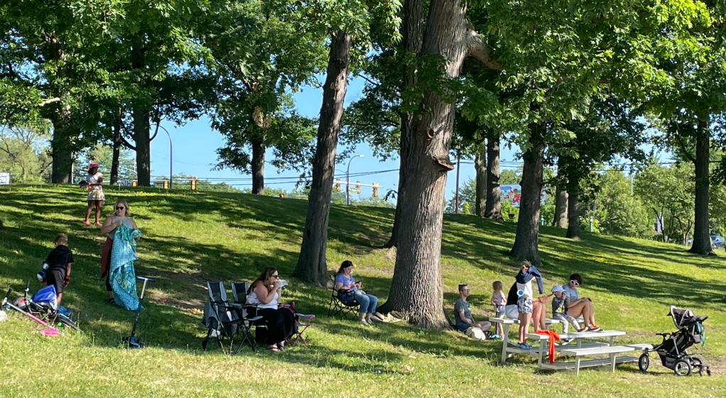 The park is a delightful setting with large oaks and plenty of space to sit in the shae or sun and watch what is happening.