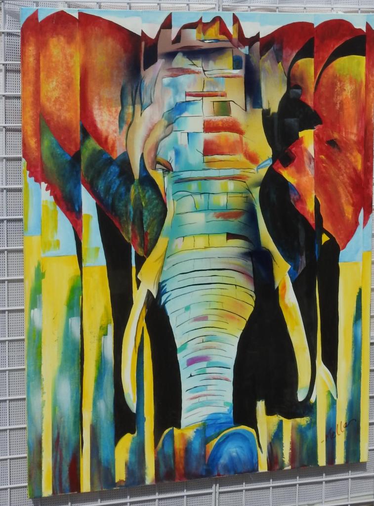 An interesting elephant and Simon pointing out a piece of fun art to Oscar.