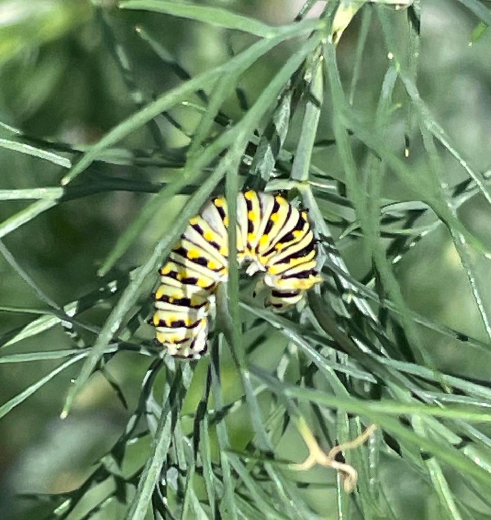 One of our dill plants is now home to a black swallowtail caterpillar. We are willing to give up some dill for this wonderful insect.