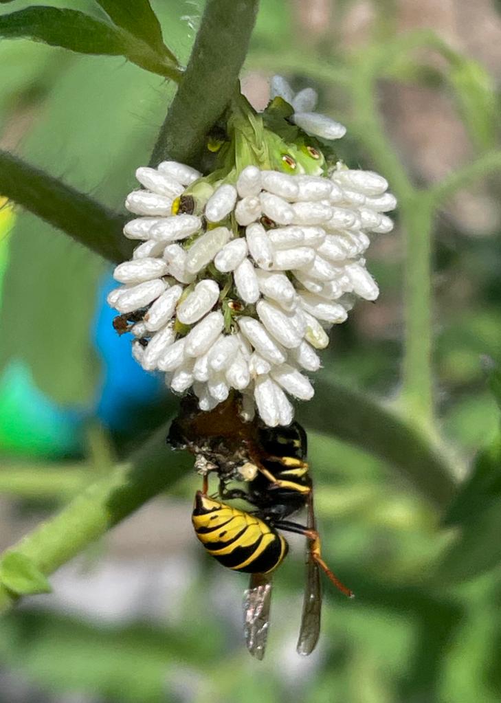 A nearby tomato plant was home to a tobacco hornworm moth caterpillar. However this pest did not pair well. It was first parasitized (all of the while chrysalis structures), then as it shriveled it became food for a yellowjacket. Glad to see this one gone.