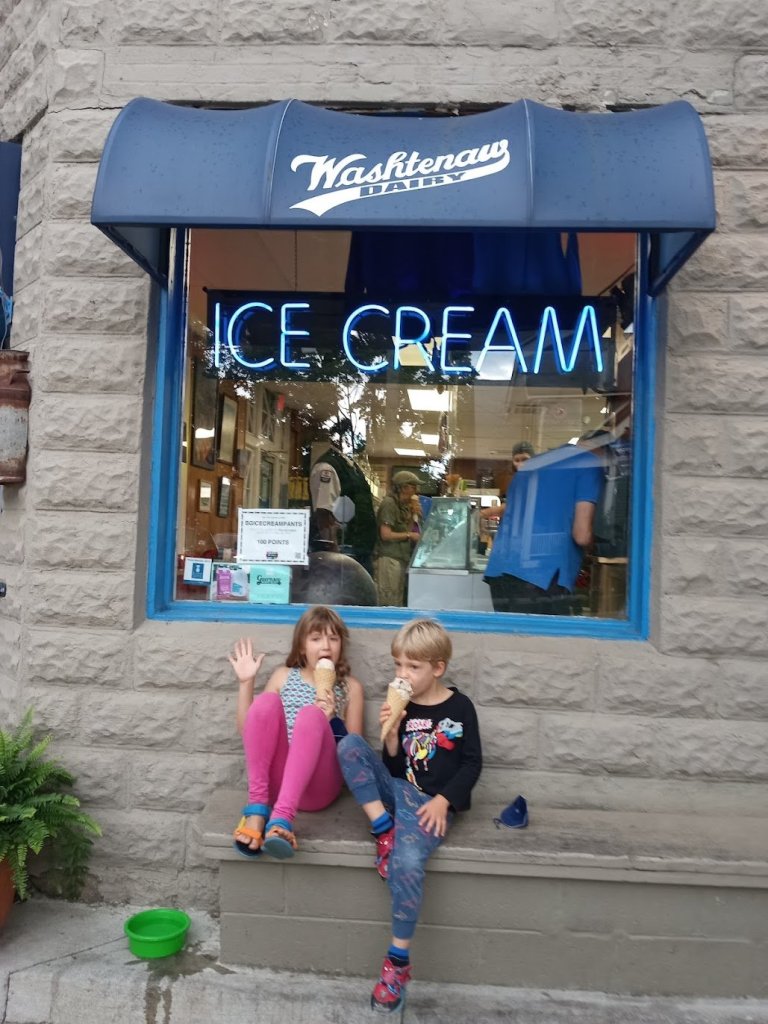 Then it was time to go to Washtenaw Dairy for ice cream. Before coming home Alexis got a photo of Oscar and Camilla with their cones.