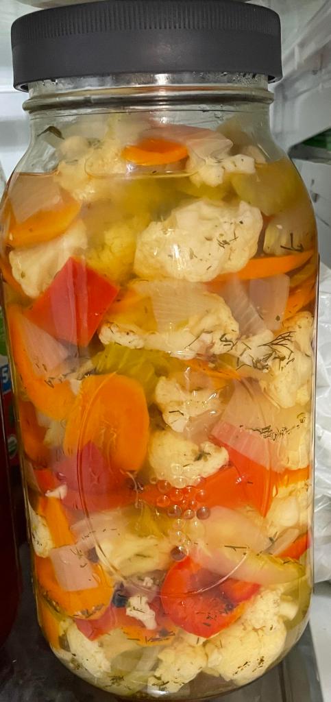 A quart of giardiniera in the refrigerator. This “might” last us until late September. It has cauliflower, red pepper, onion, carrot and celery. I could have added green beans, but didn’t have any when everything else was ready for pickling.