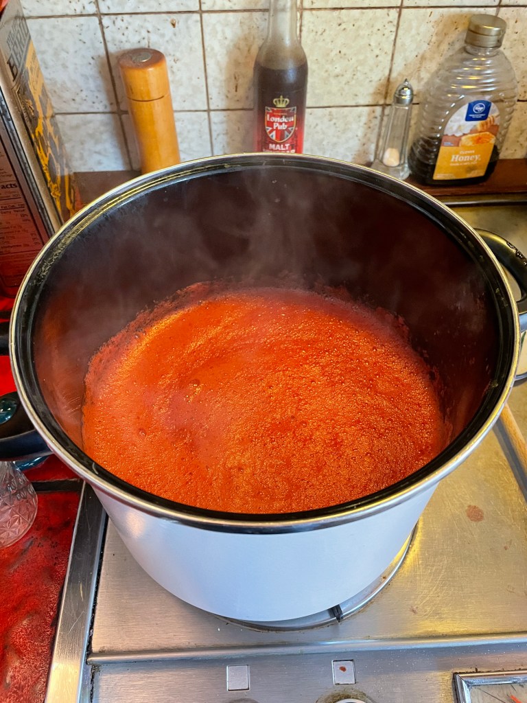 Processed tomatoes, and cooking on the stove. Later in the day this will be ready for canning.