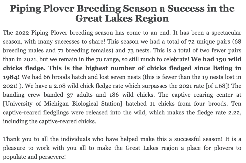 My day started reaching the Michigan Audubon newsletter which included the above report about Piping Plovers. What a great way to start the day.