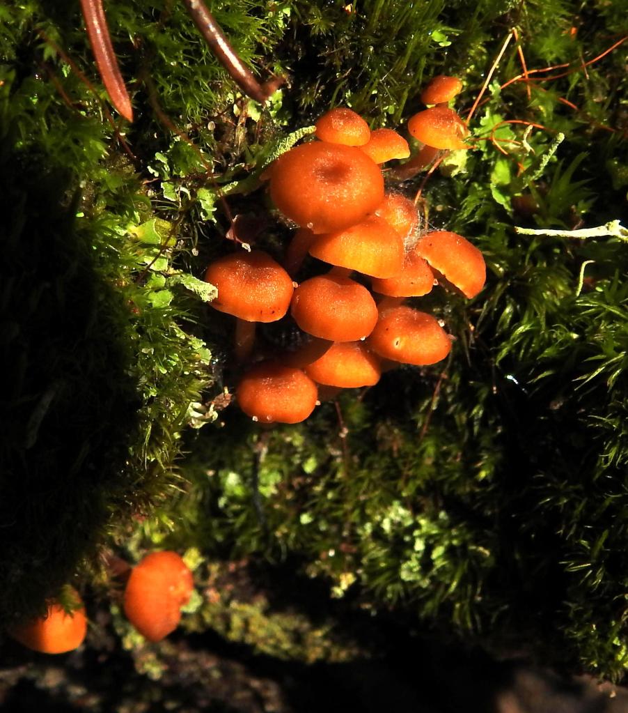 We managed to find some interesting fungi. The fungus on the right is Coral tooth fungus (Hericium coralloides). The orange one on the left is Orange mycene (Mycene lyane).