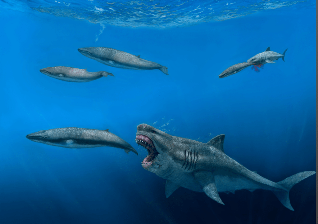 The shark cartoon reminded me of megalodon, an ancient species. I’ve collected some fossil teeth from them. This is an artists rendering of one hunting small whales.