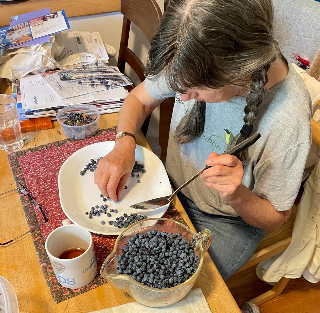 Susan sorting blueberries that we picked around our cabin before coming back to Ann Arbor.