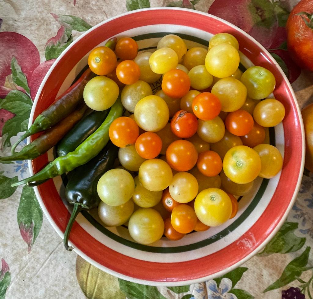 Cherry tomatoes before I went and picked more from the garden, and after I did. Looks like a lot for dinner tonight.