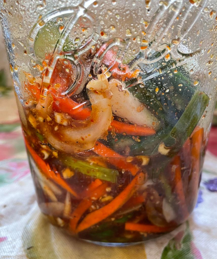 My first try at making kimchi. This is a recipe for making cucumber kimchi, with some green onions, sliced onions and carrot. I’ll let you know how this works in a couple of days.