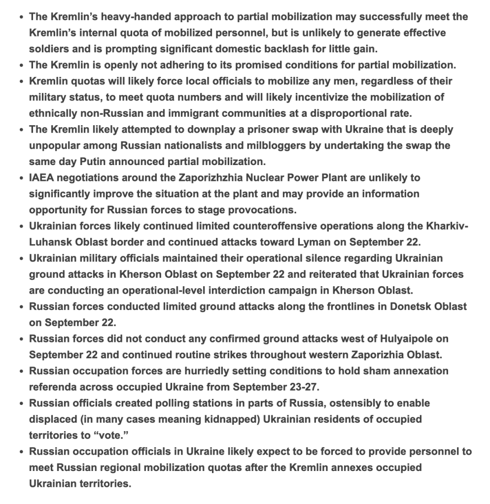 The “actual” events happening currently. A forced election, that is most likely rigged. An excuse for annexing south eastern Ukraine, and the probable conscription of Ukrainians into the Russian army with hopes that they will fight against their own country. As the invasion is now in the seventh month there is still hope that Ukrainian forces can drive Russian forces out, but every move damages more Ukrainian infrastructure. Hopefully, with the help of western aid this will end soon.