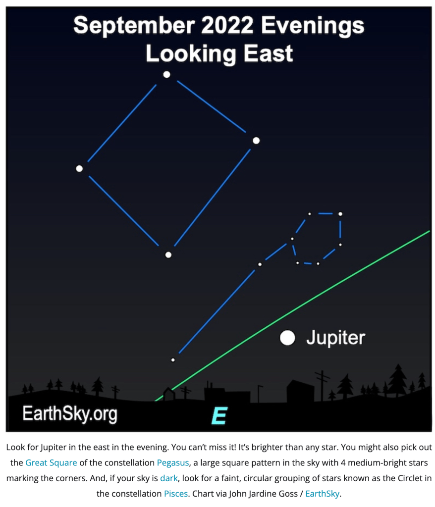 Starting tonight, get out at sunset and scan the sky to the east for the bright “star,” Jupiter. I think that I’ll be out tonight with our spotting scope looking for it from Ann Arbor. Hopefully, it will be clear.