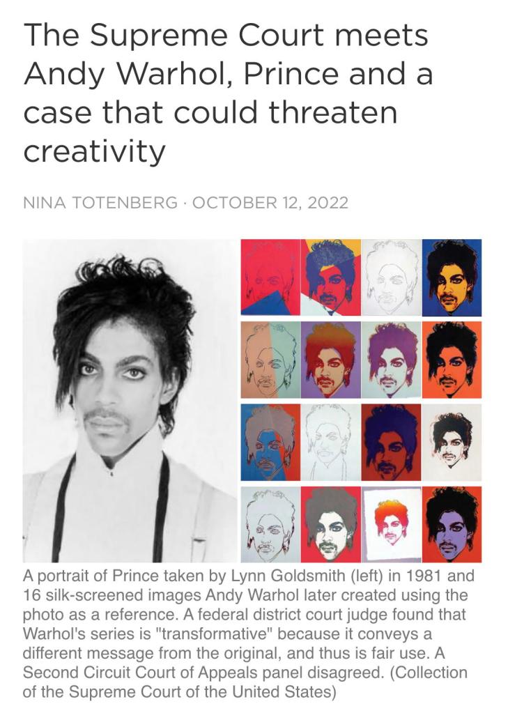 Apparently Lynn Goldsmith is suing over the use of her image as the “model” for Warhol’s silk-screens. I believe that the Supreme Court is not ruling in her favor.