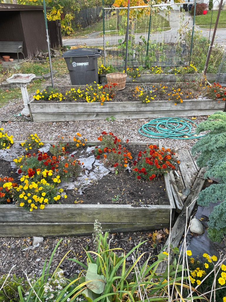 Susan canned diced Roma tomatoes last night. We still have some 20 pounds of green tomatoes that are waiting to ripen. When they do they will become either diced tomatoes or tomato sauce. Two of the raised beds have had the plants removed leaving only a few marigolds.
