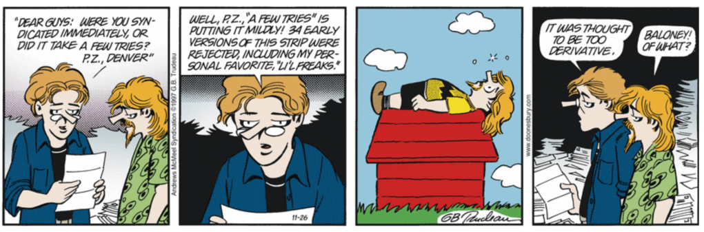Today would have been Charles Schulz’s 100th birthday. These are the stamps that the USPS issued to mark the date. There were a lot of cartoon today that referred to him. But first.