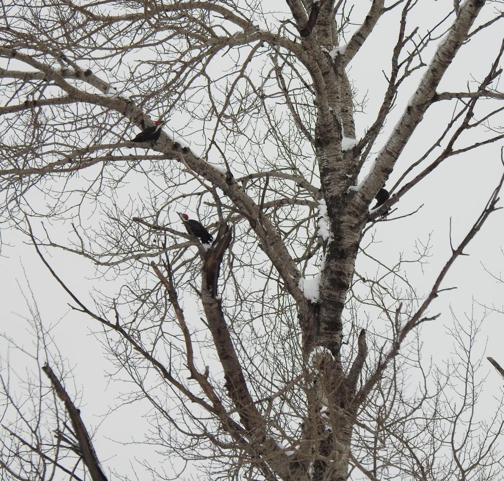 A tree full of Pileated Woodpeckers (three in this tree, one in a nearby tree).