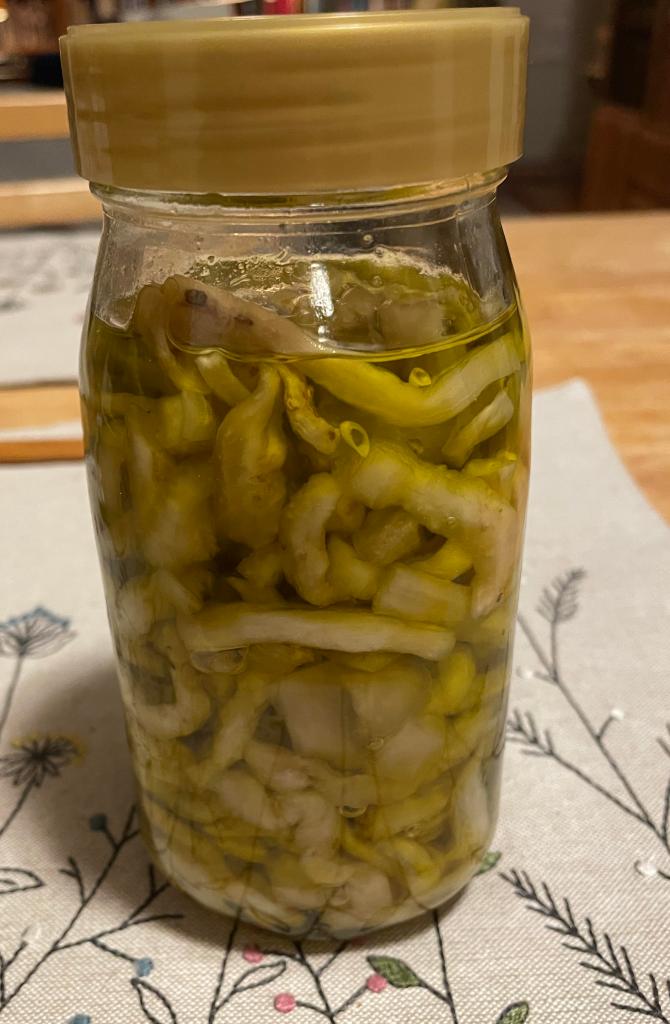Pickled eggplant – another experiment with pickling. And, is Susan’s opinion it turned out quite well. Since this is sitting in olive oil it sits out on the counter, not in the refrigerator.