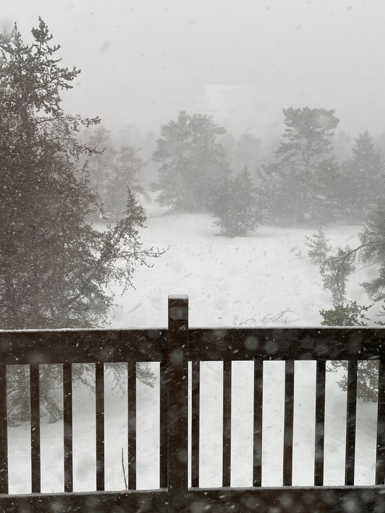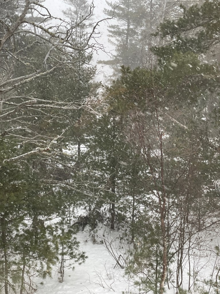 By the time we had settled in back at the cabin the real snow started falling. The left photo is looking east towards Whitefish Bay, which you can’t see. The right photo is looking west from our bedroom.