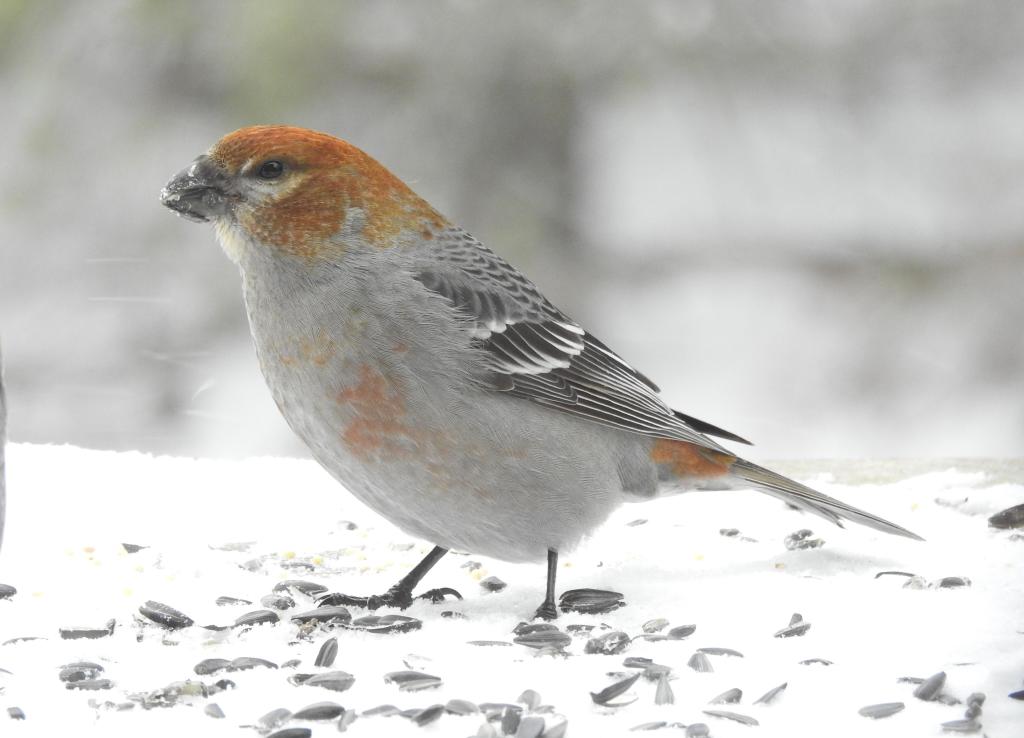Male Pine Grosbeak on the deck.
