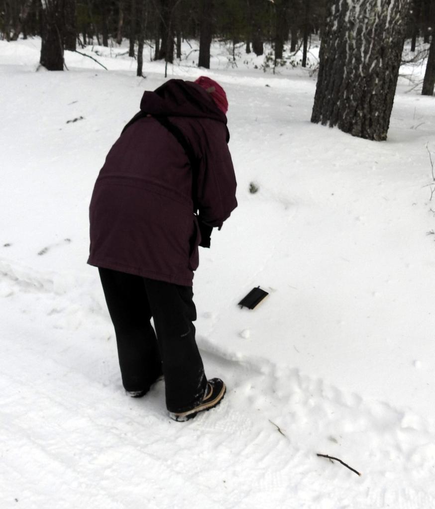Susan photographing animal small mammal tracks on the chilly morning.