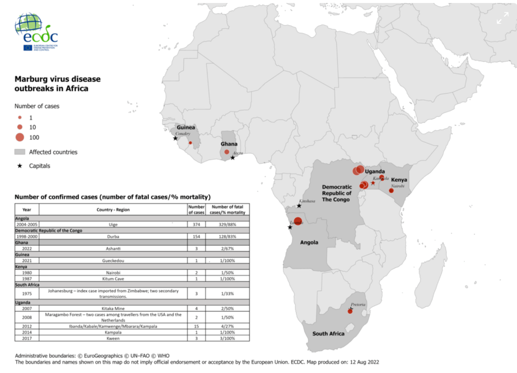 There is currently an outbreak of Marburg Virus Disease (a hemorrhagic viral disease caused by Marburg Virus) in Equatorial Guinea, Africa. There is no vaccine for this virus, and it has a close to 90% death rate. Currently there have been nine deaths and eight suspected deaths. There are also 16 cases and 21 people who have been in contact with people who had the disease or are suspected to have the disease.