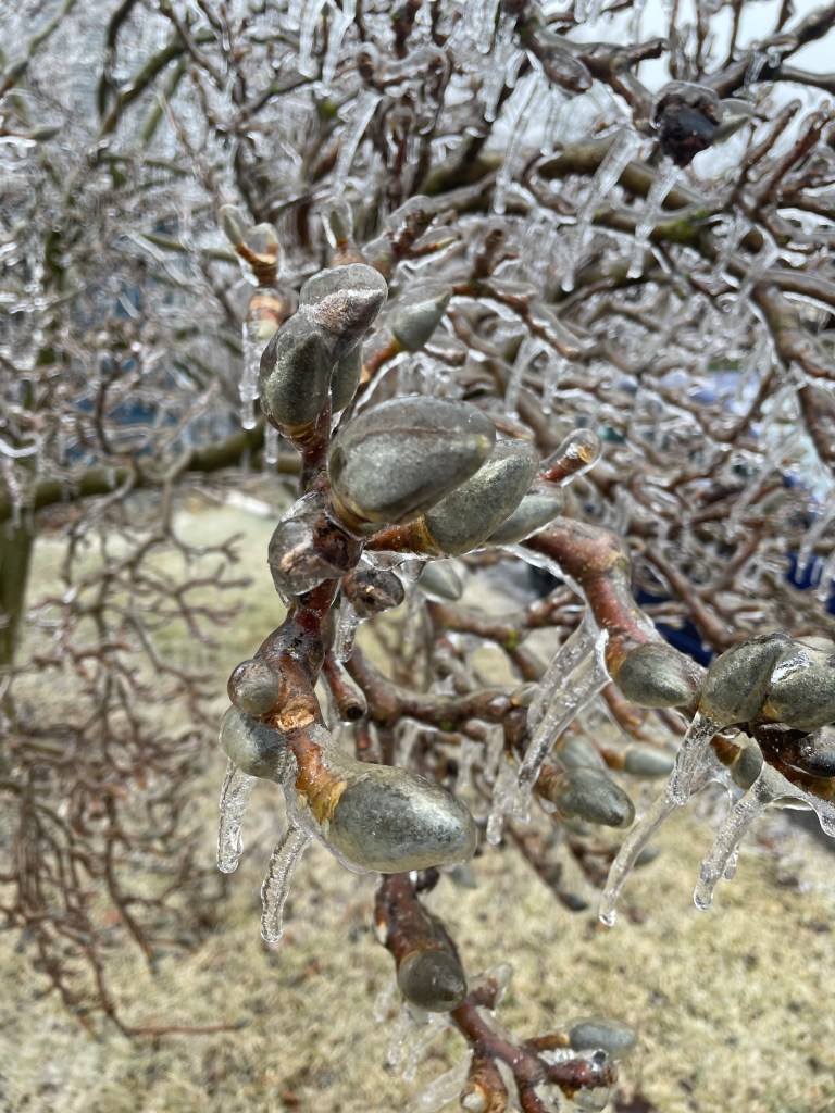One of the sugar maples next to our house coated with ice. A magnolia that we saw on our walk with the buds coated in ice.