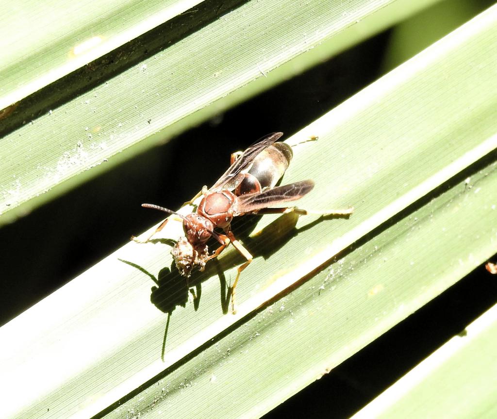 This Polistes wasp was stealing from the orb-weavers web. I thought that was a daring, but interesting strategy.
