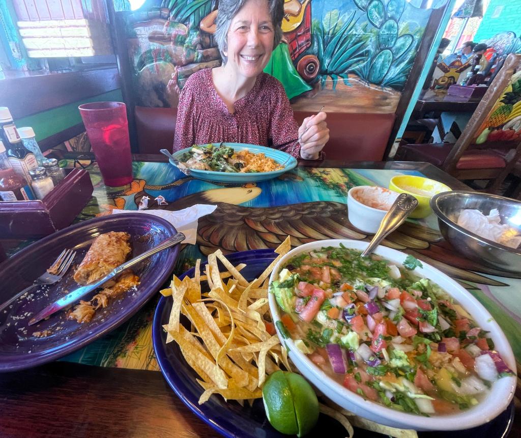 And – here’s dinner (yesterday and left-overs tonight). Susan had chilis rellenos. I had one tamale and a “huge” bowl of sopa Azteca, aka tortilla soup. The food here is just like I would expect in central Mexico. Not only is the food excellent, but it is a great buy. My soup had a lot of chicken in it and perhaps the equivalent of 2-3 avocados, as well as tomatoes, potatoes, squash, onions, carrots and lots of cilantro.