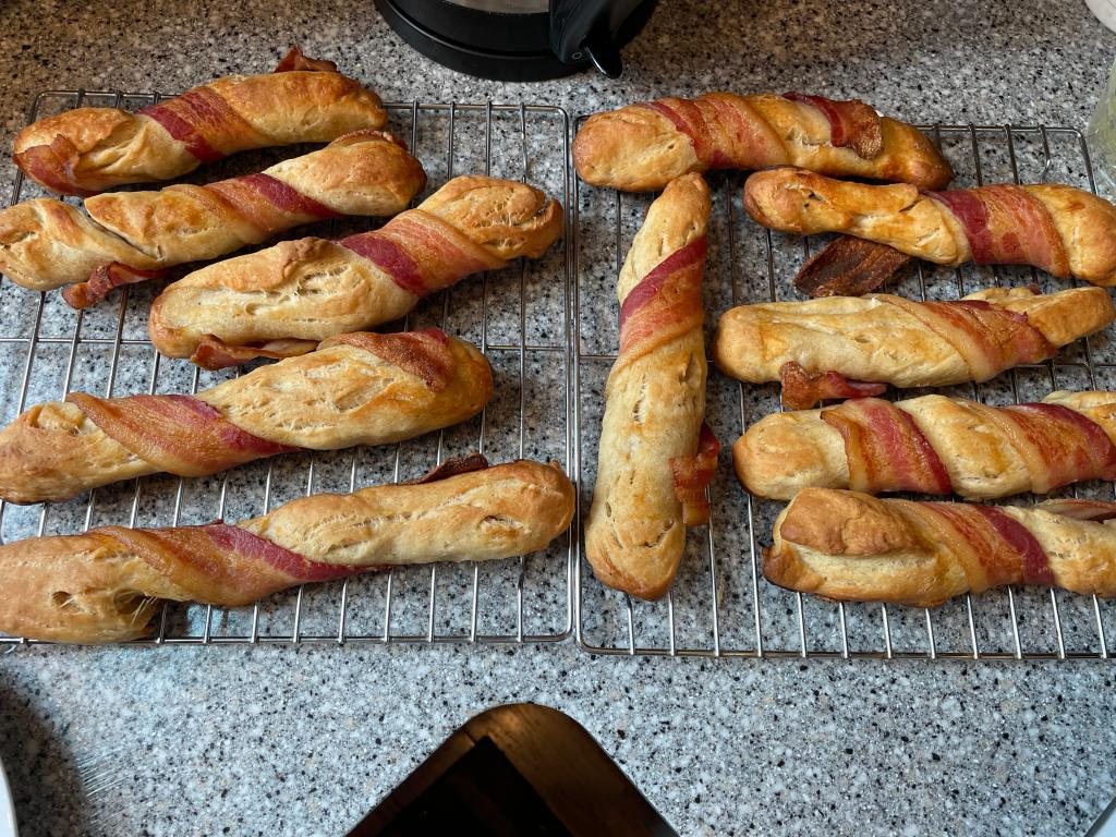 I am attempting to not be completely engulfed by birds while we are at Whitefish Point. But, since it was rainy today until close to 4PM it was easy. I filled part of the morning making bread dough, half of which went to making these. These are bacon-wrapped bread sticks. We discovered these at the bakery on Dauphin Island, Alabama. So, I figured that I could make them – how hard could it be? All it takes is bread dough rolled into a plump bread stick then wrapped with bacon. Bake at 400F for 35 minutes and this is the result. We each had one with our chili for dinner and it was pretty good.