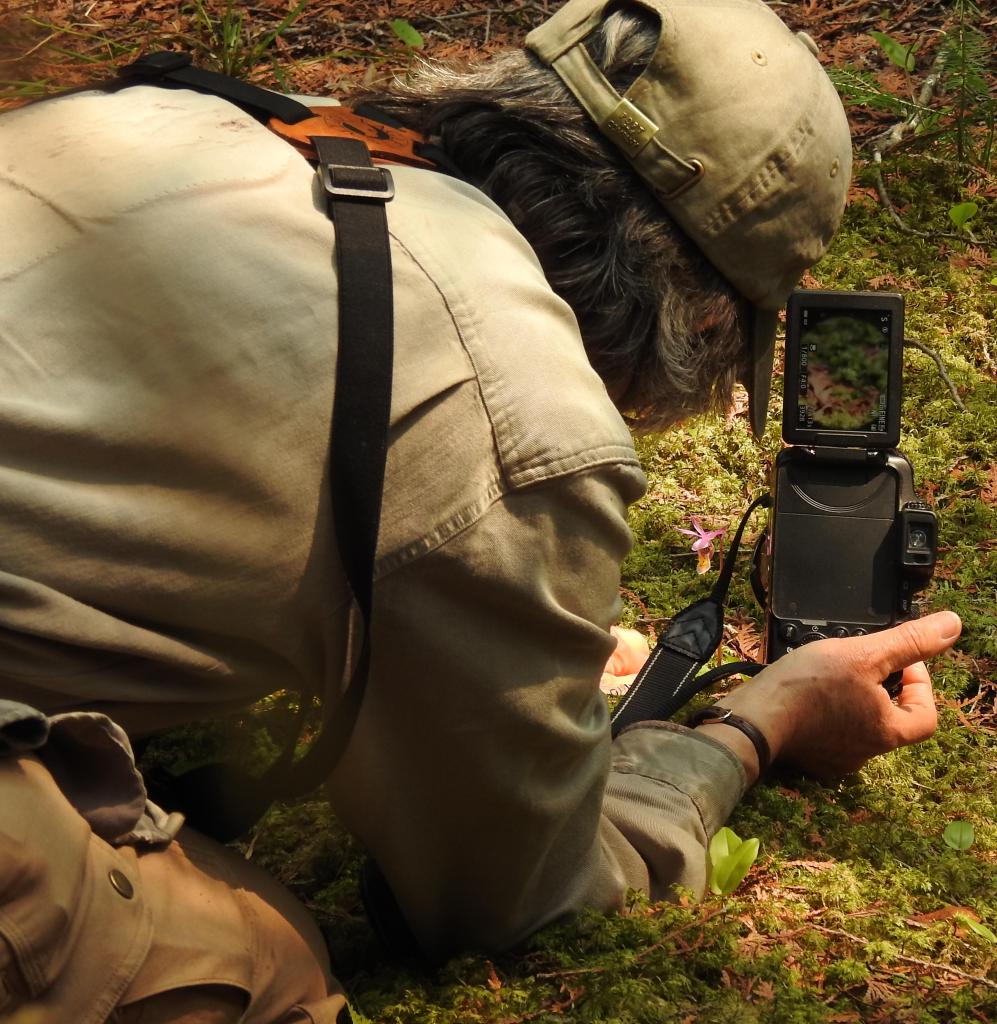 Here’s Susan photographing a fairy-slipper, showing you how small the orchid is.