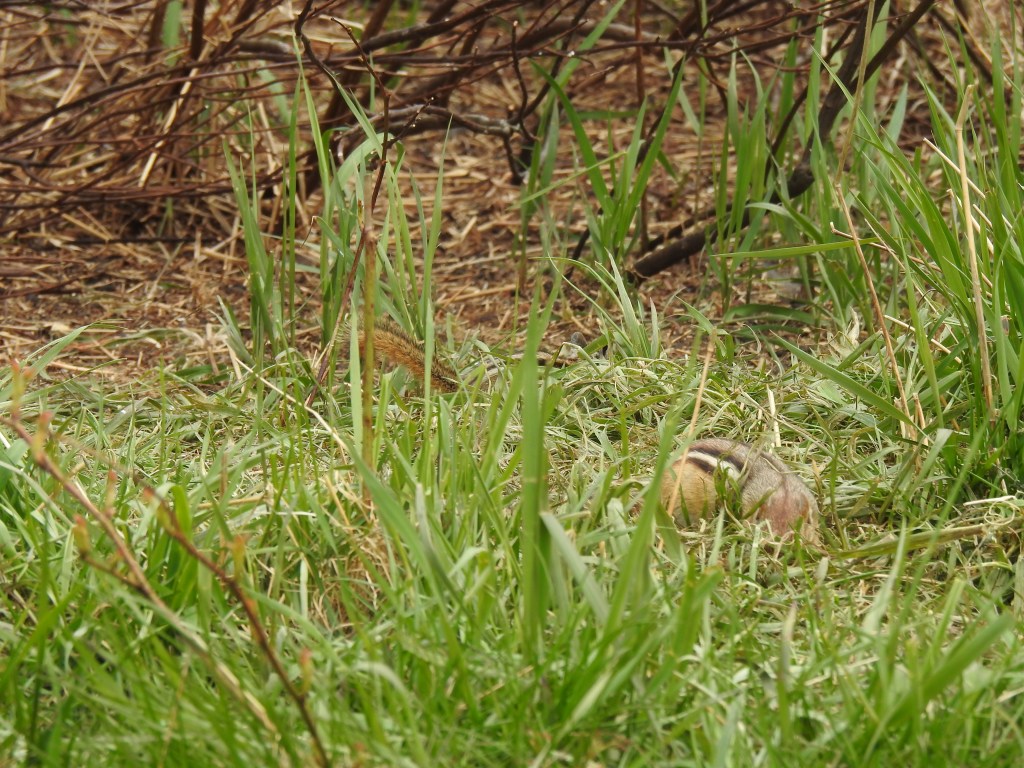 Here are two chipmunks under the feeders at Whitefish Point. The one at the front is an Eastern chipmunk, the one at the back is a Least chipmunk. Years ago, Least chipmunks were quite common in the Upper Peninsula. Then, for some reason they were almost completely replaced by Eastern chipmunks.