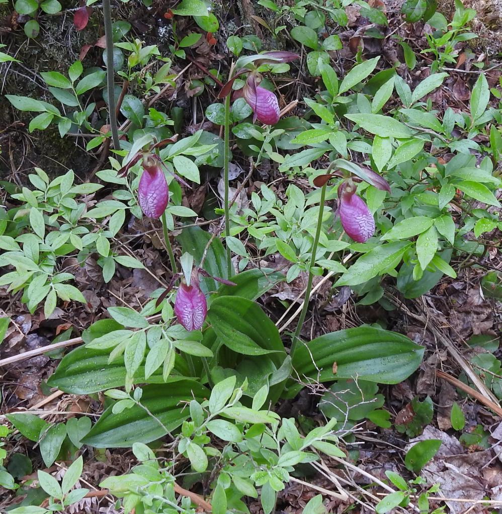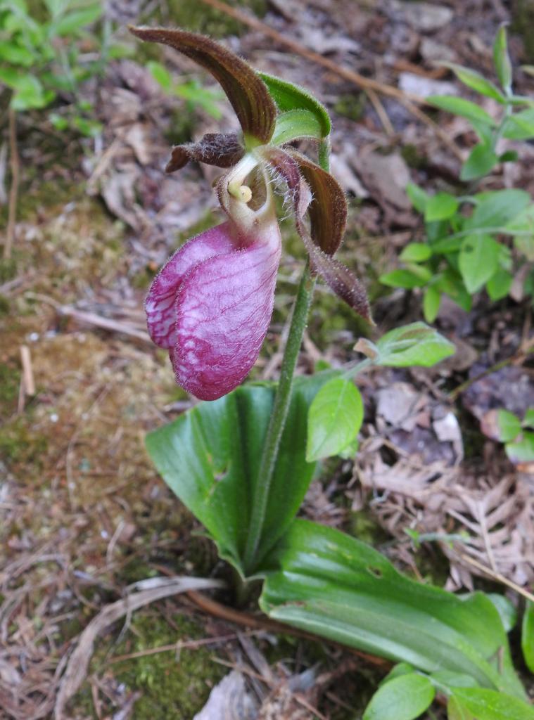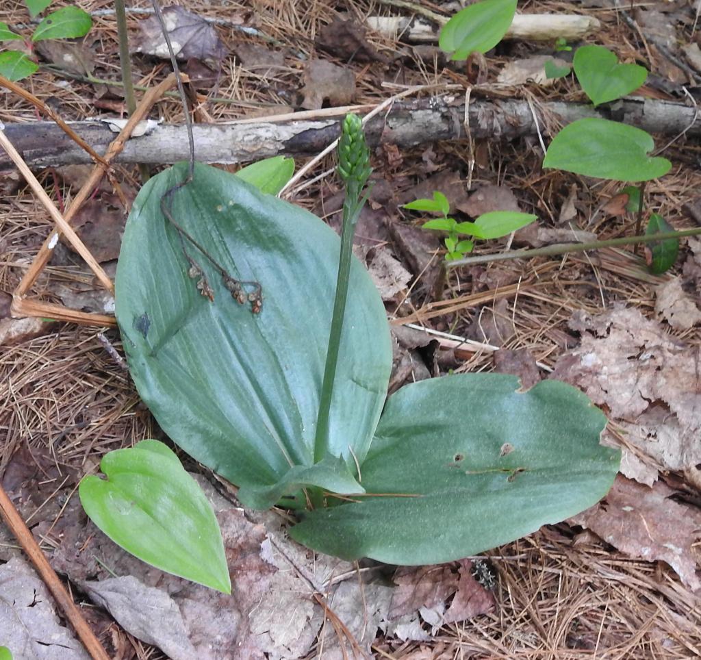 A large round-leaf orchid (Platanthera orbiculata) is sending up a flower bud. So I guess we should visit this site again, which is what we did last year.