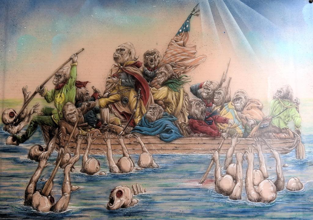 Gorillas crossing the Delaware, with some creepy alien-like critters in the water. Perhaps inspired by Planet of the Apes.