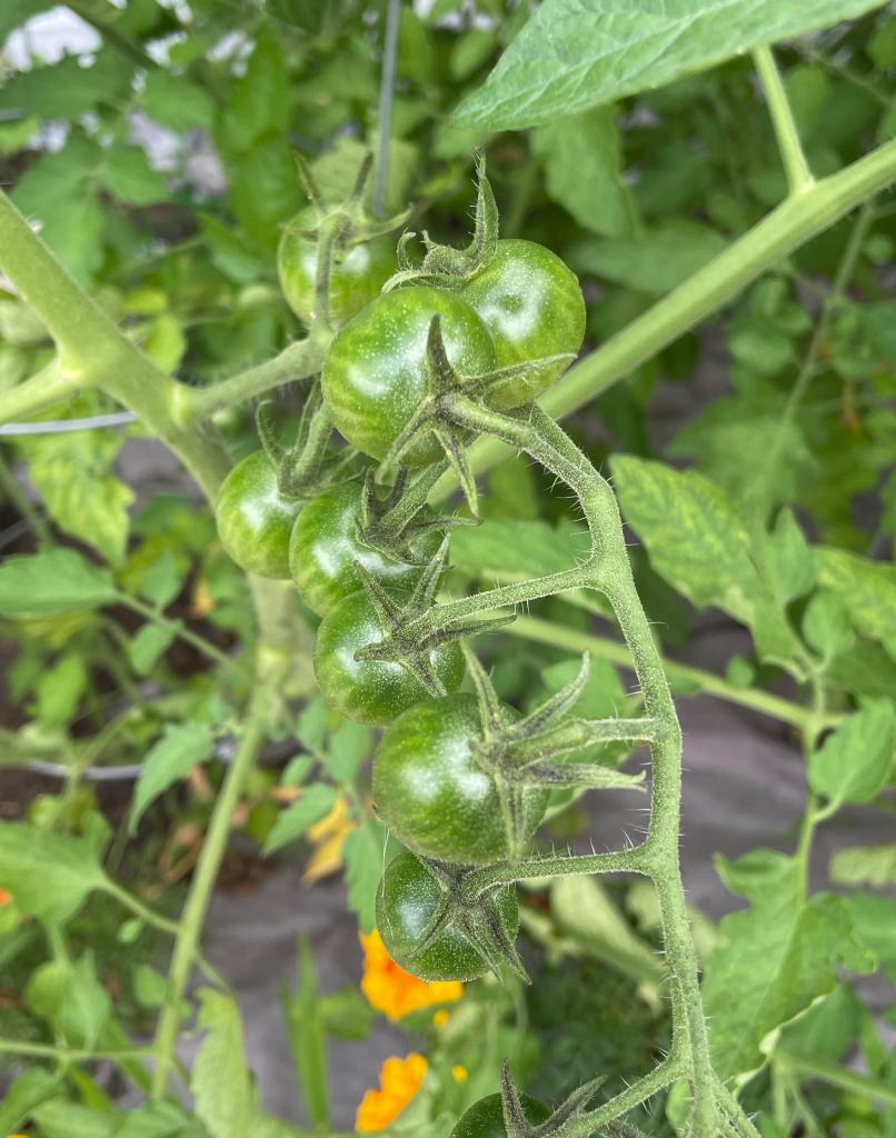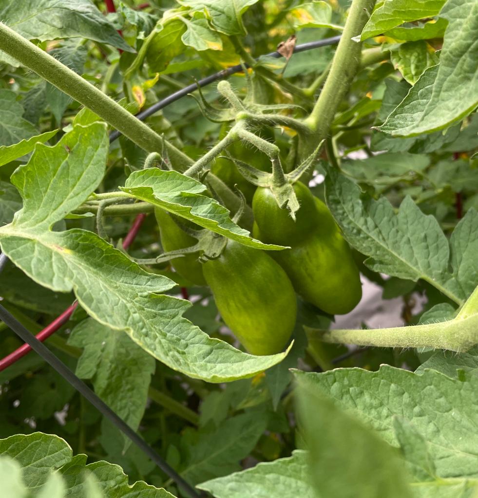 The tomatoes are going their thing – we have lots of Roma’s and San Marzano’s, which will provide tomatoes for canning. The cherry tomatoes will provide us with tomatoes for salads and eating, as well as fresh sauces.