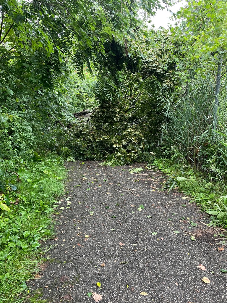 The high winds took down a lot of trees. This is the path behind our house completely blocked by a downed tree.