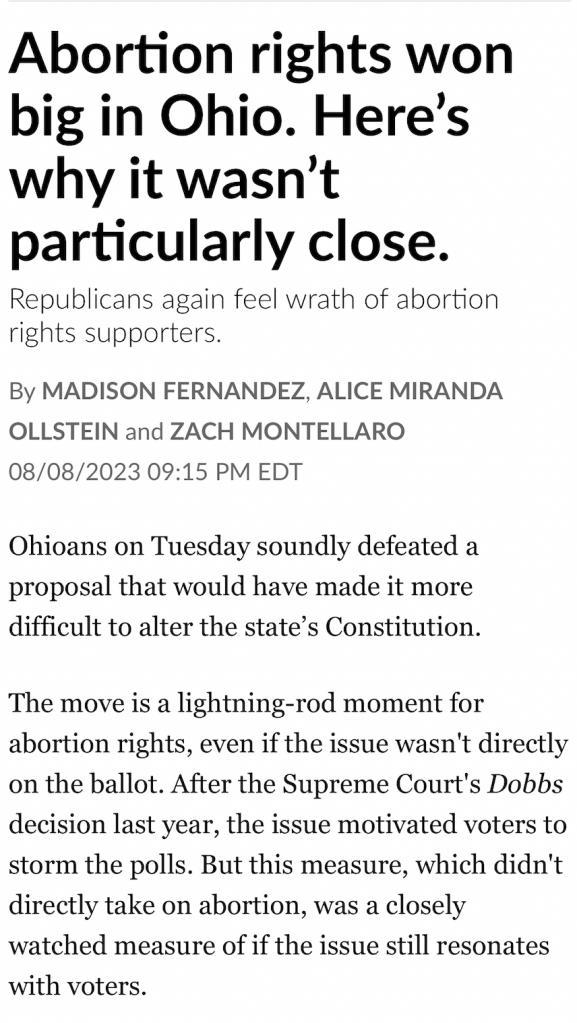 At least for now the situation concerning abortions in Ohio seem to be protected. However, Republicans are already trying to subvert the will of the people and figure out another way to ban them.