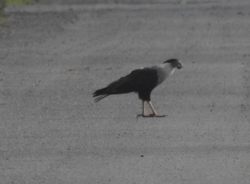 Ahead of us, down the road a Crested Caracara waqs keeping the road clean.