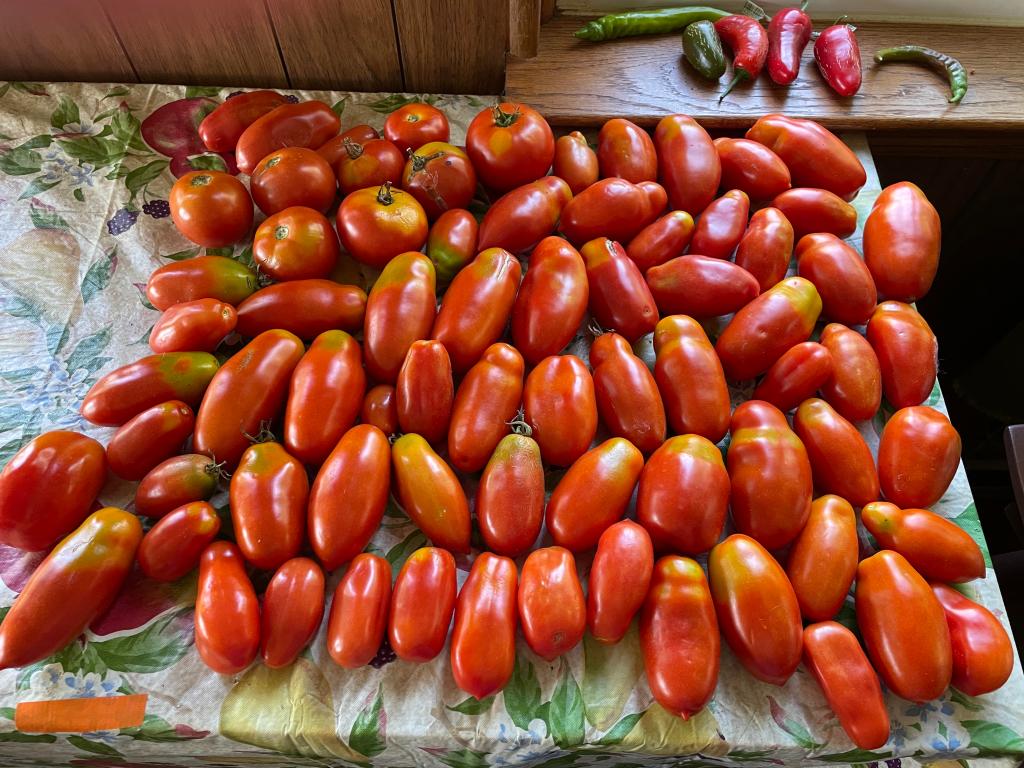 Susan’s canning efforts. Four quarts of sauce and eight pints of diced tomatoes. This winter we will be enjoying fruits of her labor.