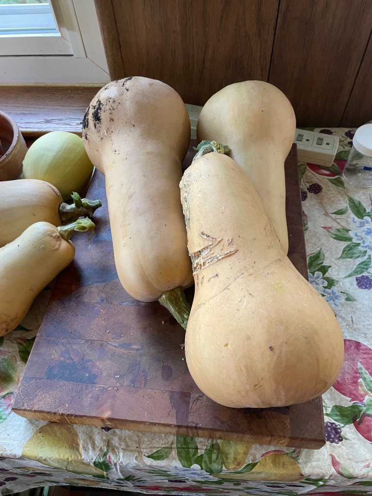 I brought in six butternut squash and two spaghetti squash. I also repotted two pepper plants. The small one on the left is still flowering and has some small peppers. The taller one on the right is an habanero plant. I also has flowers and three peppers. I’m hoping that they can finish ripening.