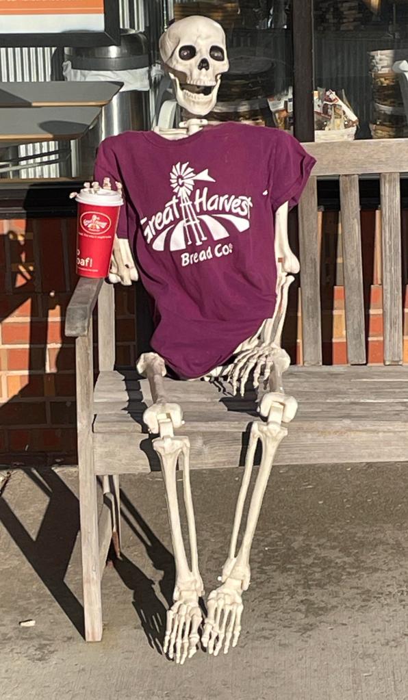 When we were out shopping the other day we went past Great Harvest where we saw this skeleton with a Great Harvest tee-shirt and cup of coffee. What a perfect way to start us all to get ready for Halloween.