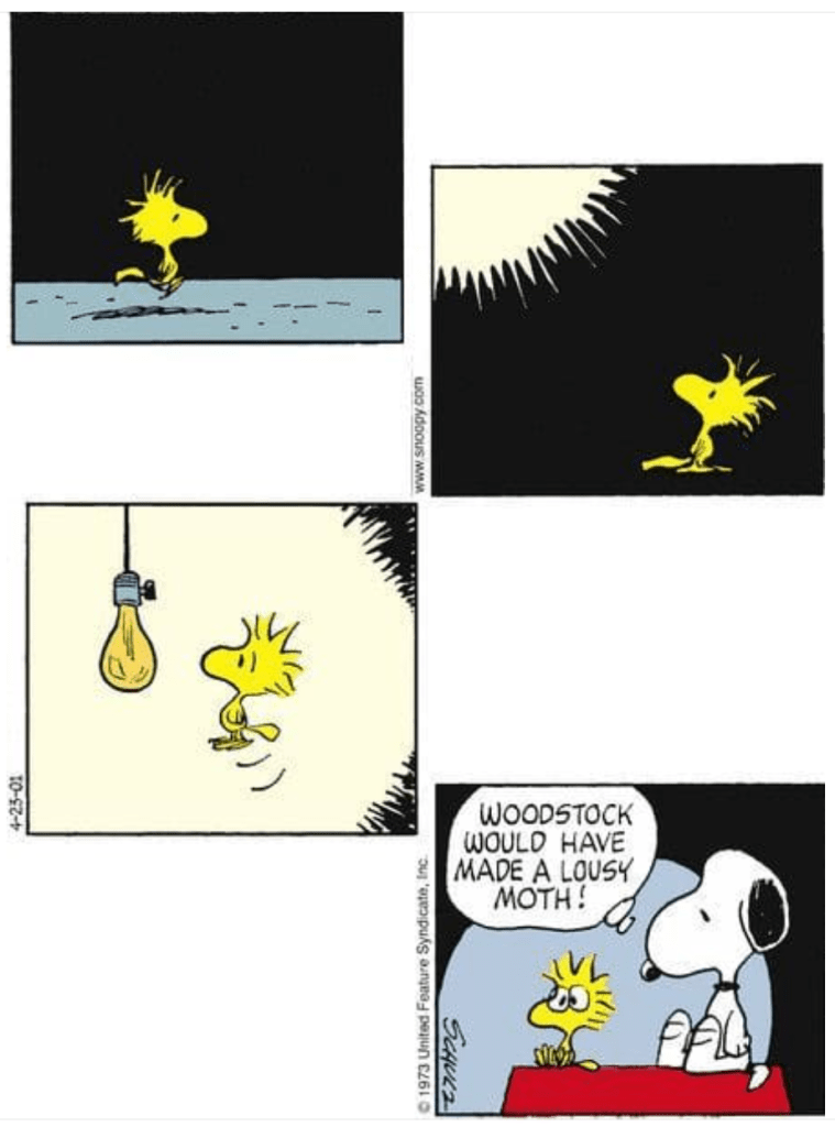 No, Woodstock wouldn’t make a good moth. But some moths still come to lights even in winter.
