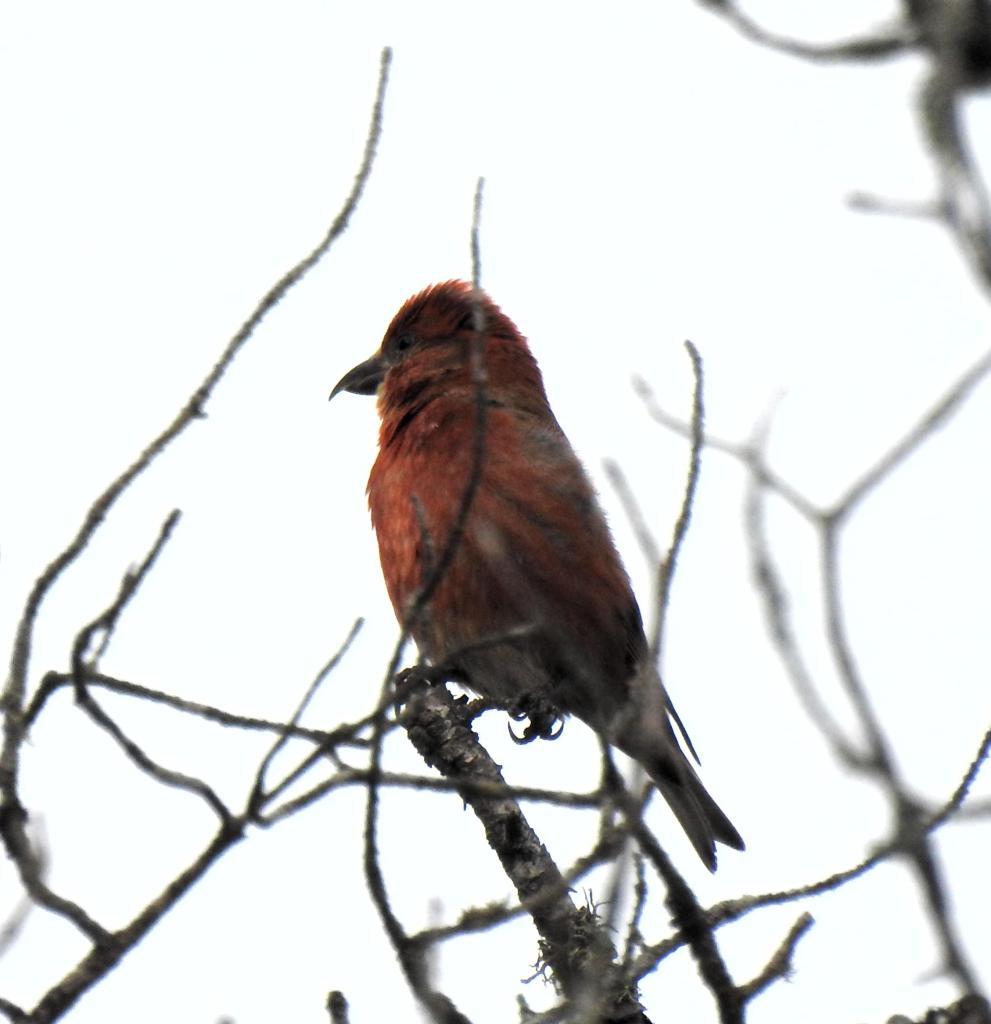 Here’s our nearby Red Crossbill male. He was perched in a tree with a nest in it. The female is in a close tree. He took off singing, not the typical chipping, but the actual song. Susan thinks that they are nest building. We’ll check the next time we’re at Whitefish Point.