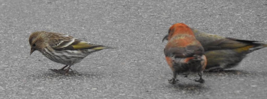 The male crossbill seems to be checking out the Pine Siskin.