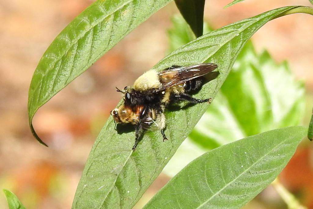 The insect on the left is a robber fly that looks quite like a bumble bee. It had just caught a honey bee that it was in the process of eating. The wasp on the right is a Mexican paper wasp female building a nest.